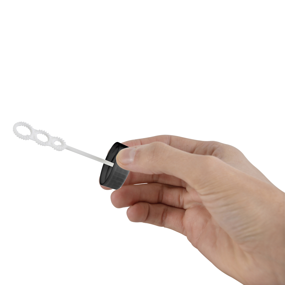 60ml white soap bubble bottle with 3-in-1 bubble wand. Available in white with black lid.